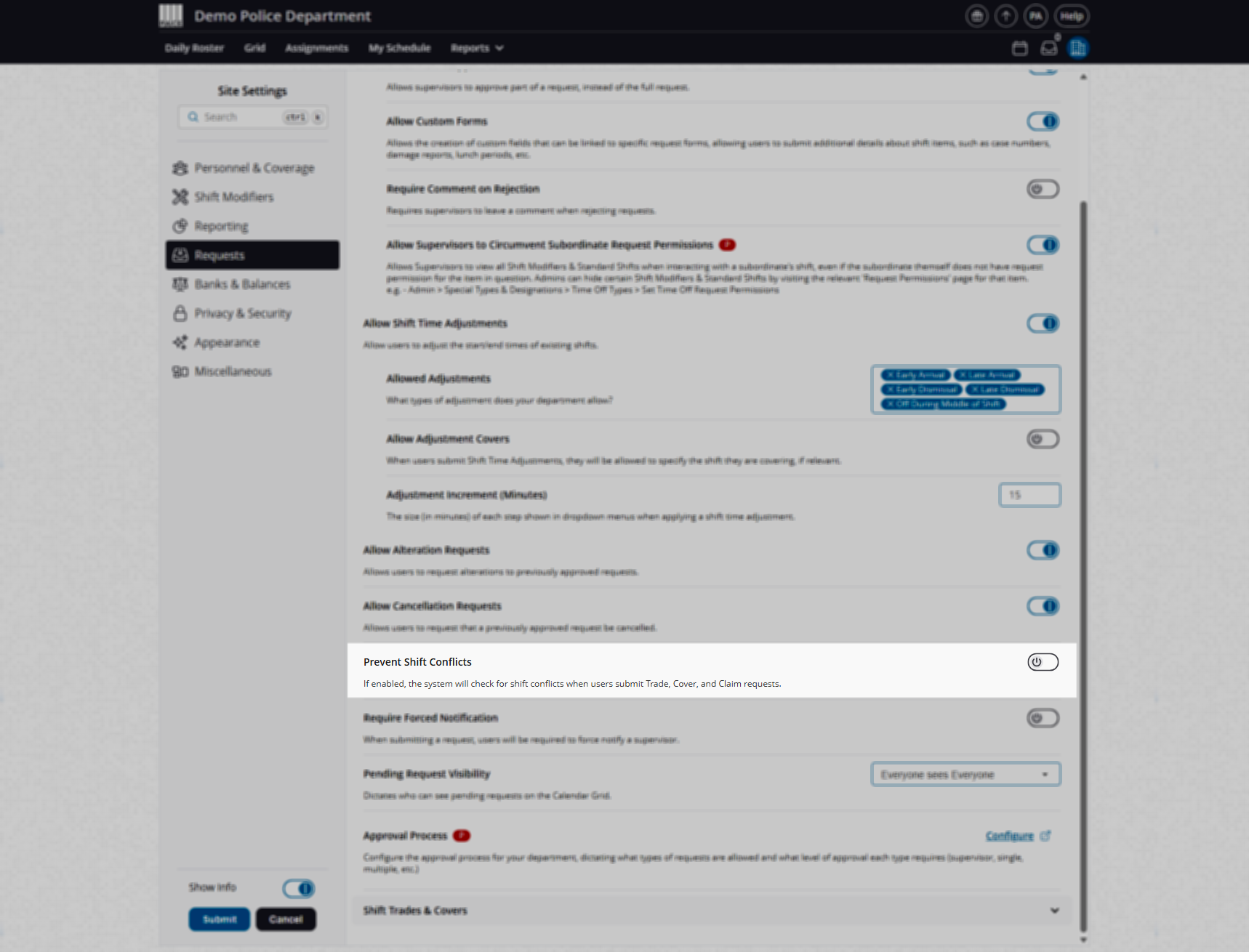 This article explains how to allow officers to sign up for extra overtime (OT) shifts even when they already have scheduled activities such as on-call assignments, K9 maintenance, or other logged time during the same time period. This behavior is controlled by the Prevent Shift Conflicts setting in Site Settings.