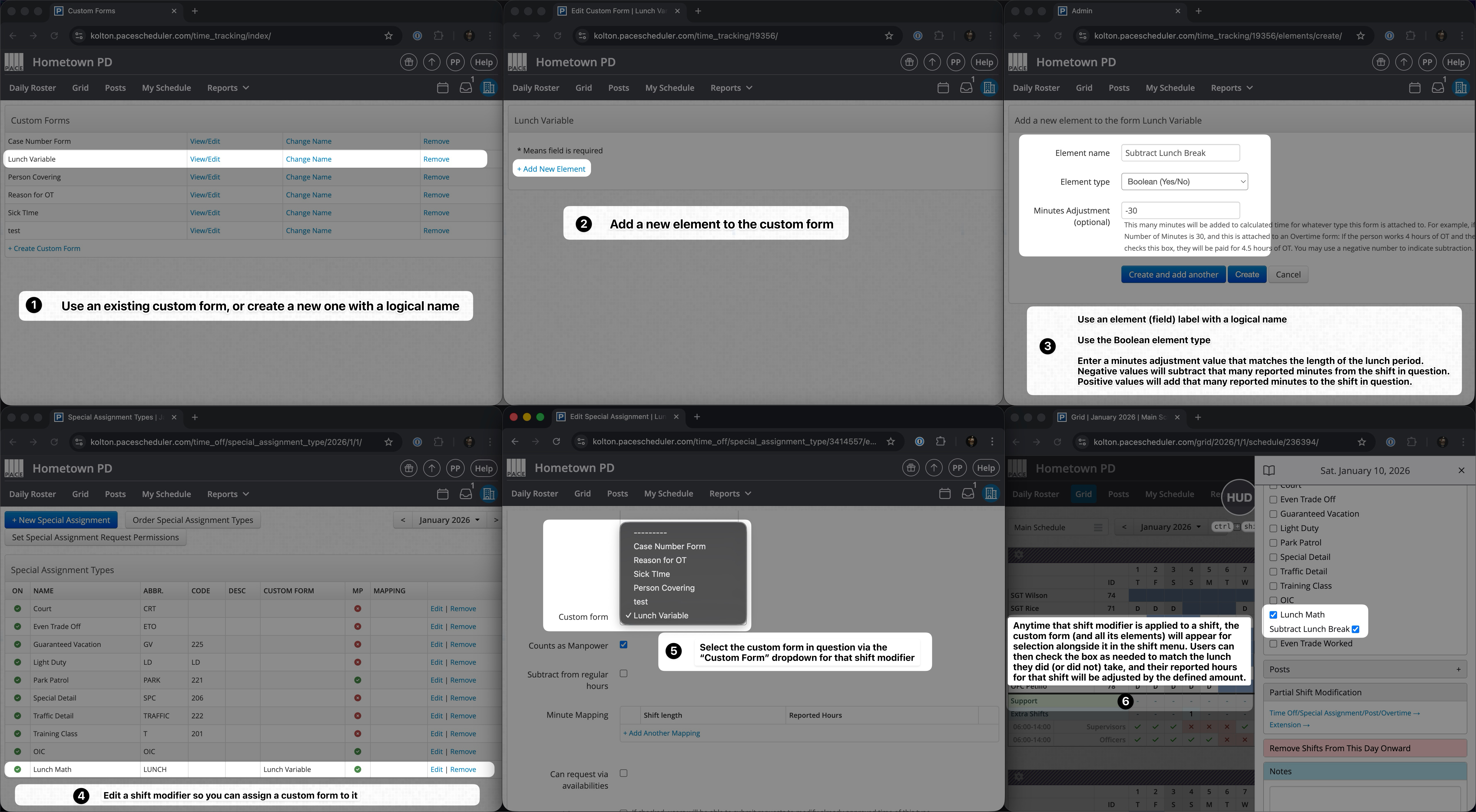 The image below concisely lays out the necessary steps to configure & subsequently leverage custom forms and shift modifiers to dynamically account for lunch breaks.