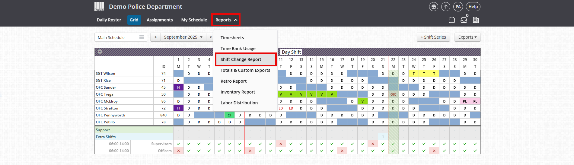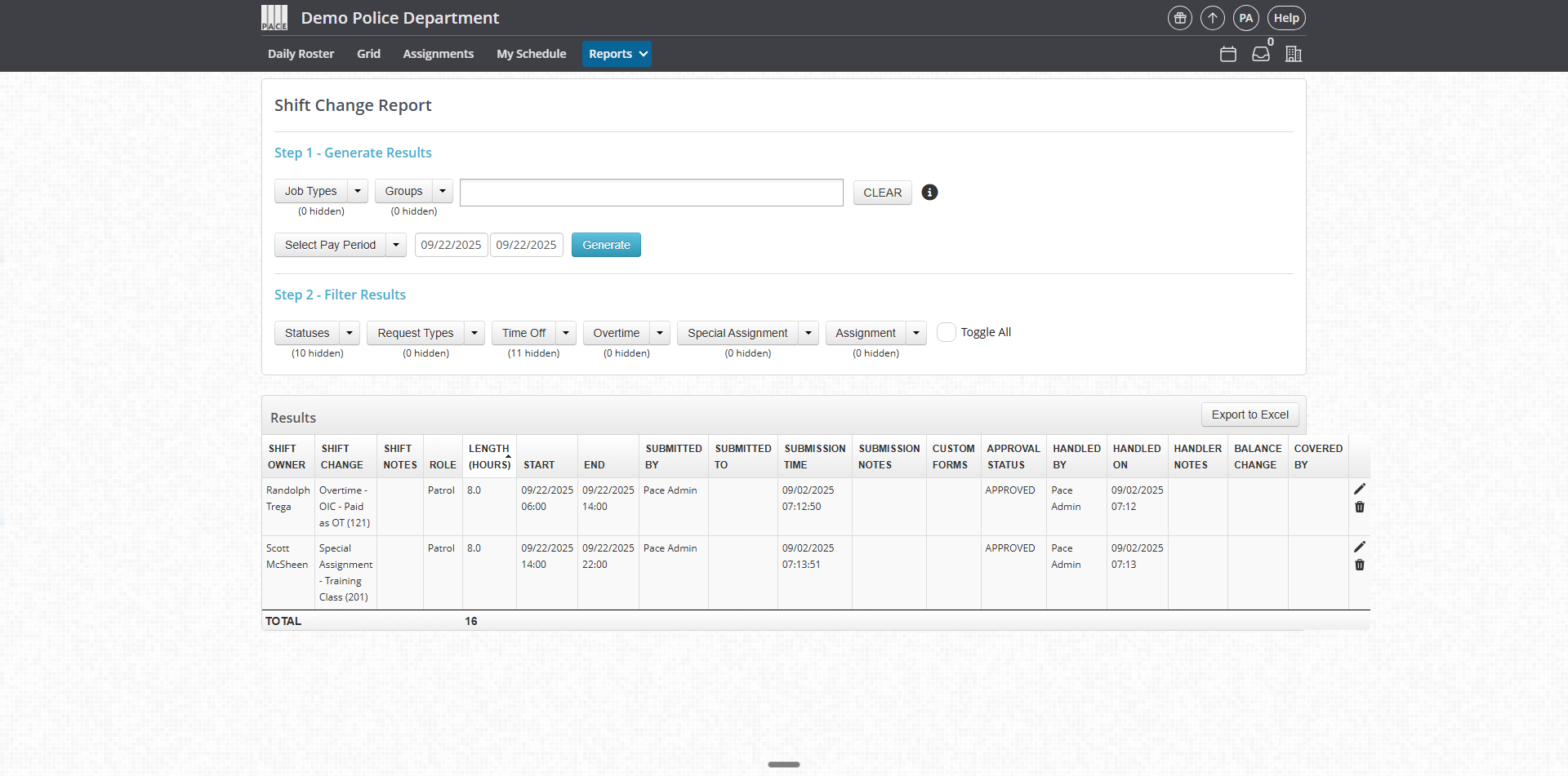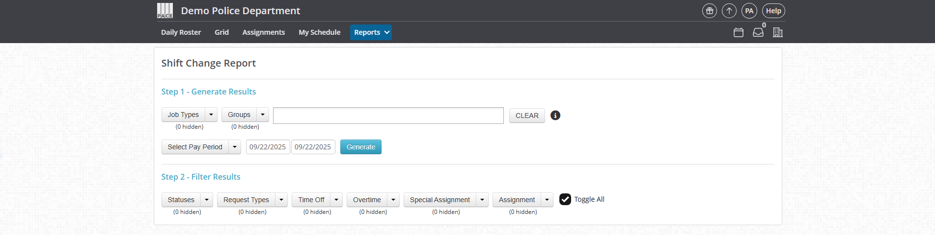 The Shift Change Report lets you track changes made to the schedule, including time-off requests, overtime, trades, special assignments, and more. You can filter by date, employee, job type, and request details. Results update automatically in real time as you adjust filters.