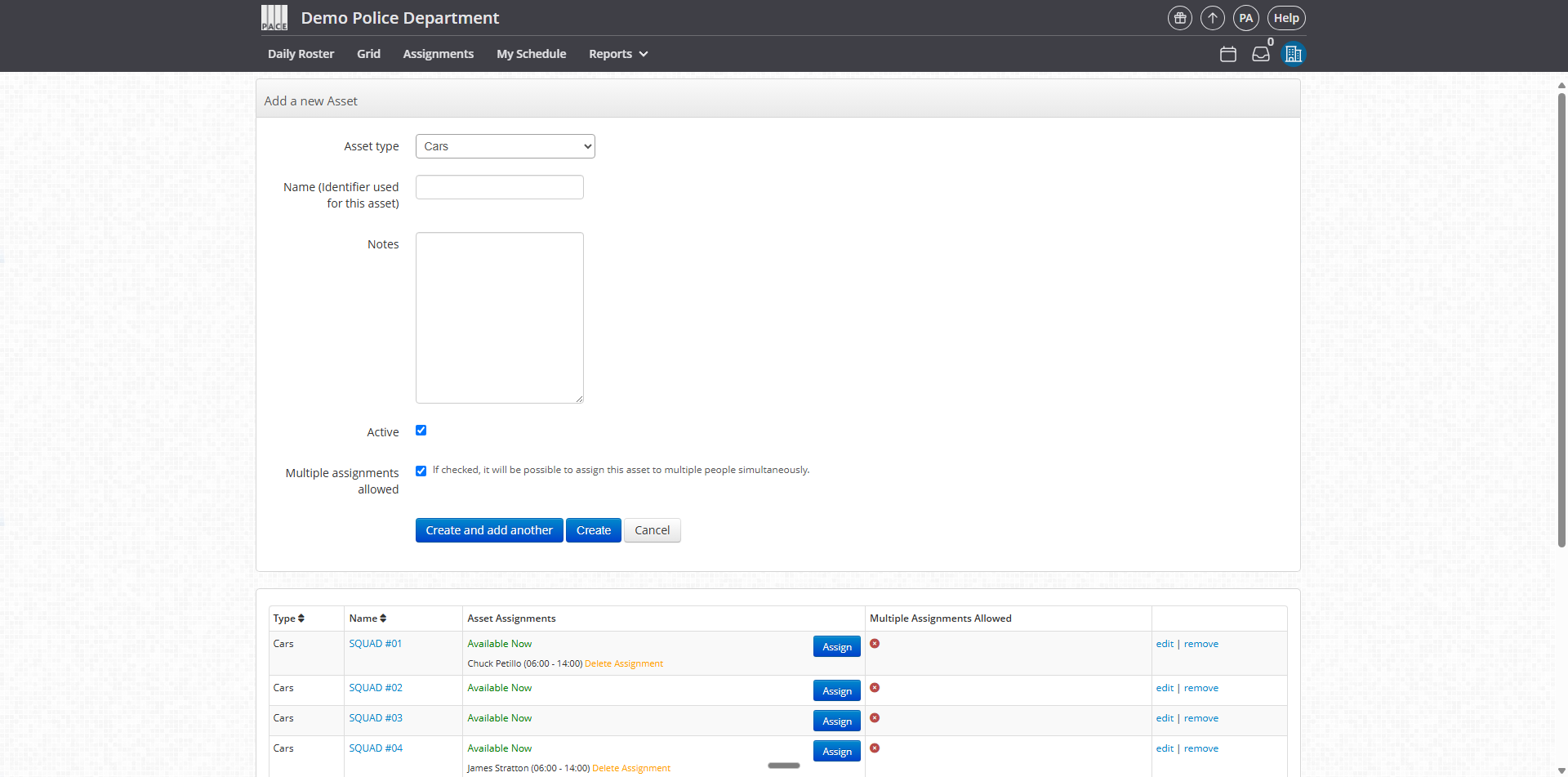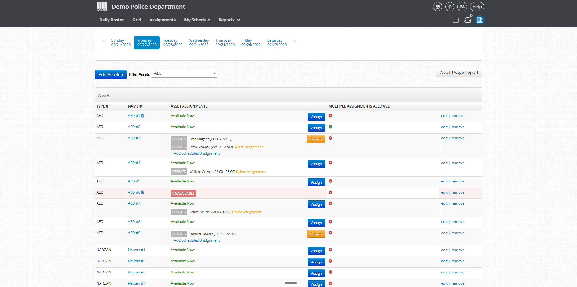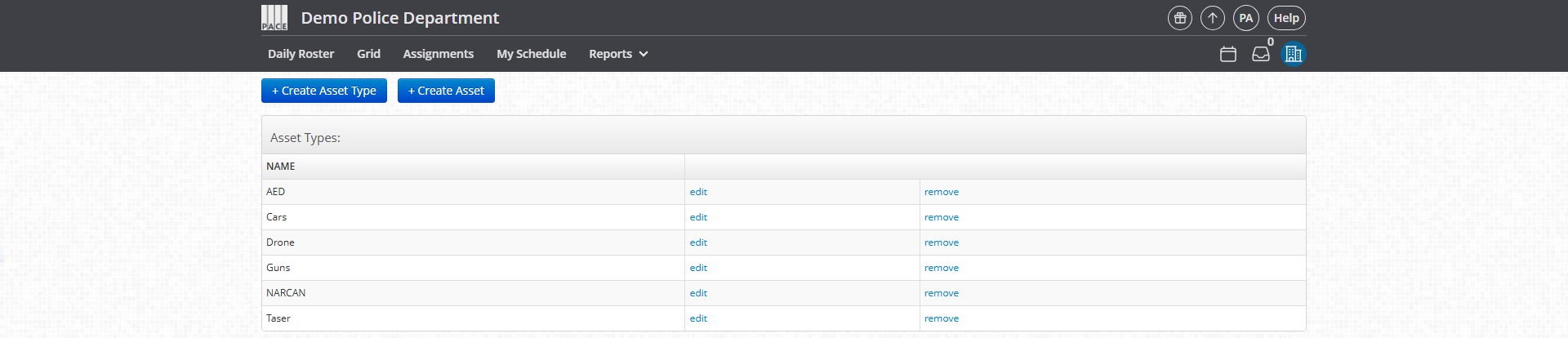 Asset Types → Categories of assets (e.g., Squad Car, Rifle, AED, Taser).